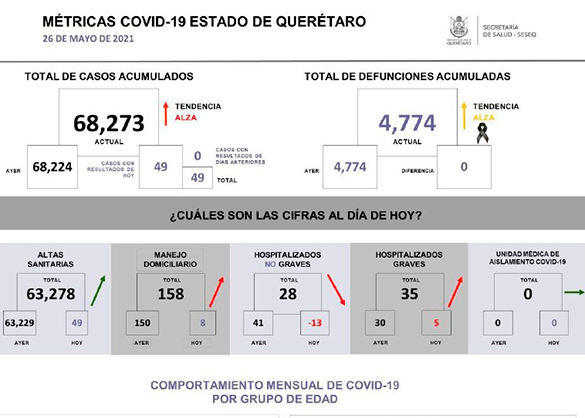 Por segundo día consecutivo, la Secretaría de Salud de Querétaro reportó cero defunciones por COVID-19, y se sumaron 49 casos de la enfermedad; se trata de 23 mujeres y 26 hombres.