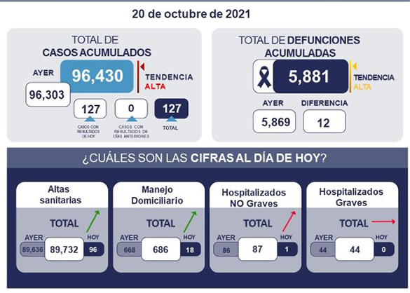 Con sintomatología leve, aislamiento y manejo en su domicilio hay 686 pacientes y 131 hospitalizados, 44 de los cuales se encuentran graves. Se han registrado cinco mil 881 defunciones.
