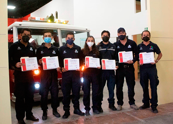 Durante la entrega de constancias en la Estación Número seis de los Bomberos, la Secretaria de Servicios Públicos municipales, Alejandra Haro de la Torre, agradeció a la corporación por el conocimiento compartido que permitirá a los rescatistas del Municipio profesionalizar su labor para dar una mejor respuesta ante los reportes de la ciudadanía.