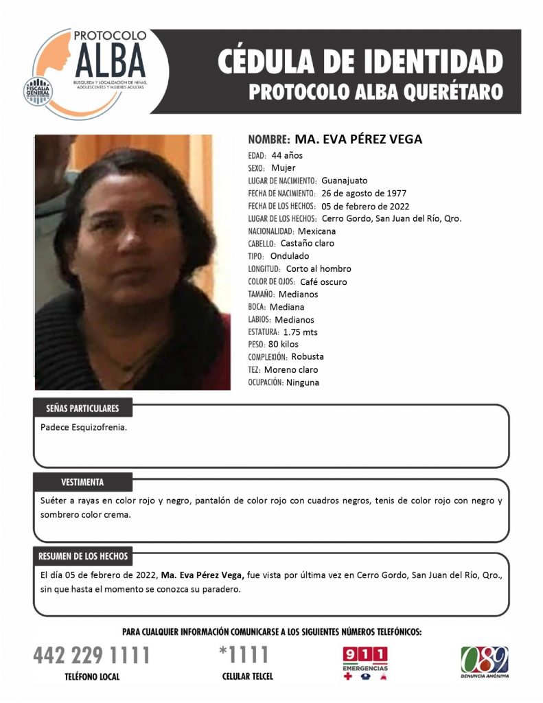 La Fiscalía General del Estado informa de la activación de la cédula de Protocolo Alba, de Ma. Eva Pérez Vega.