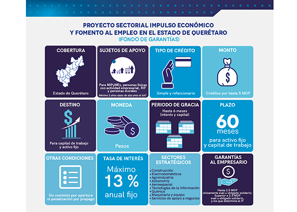Las empresas interesadas pueden solicitar que la administración estatal sea su aval en la solicitud de un crédito bancario simple o refaccionario por hasta cinco millones de pesos, monto que se podrá utilizar para capital de trabajo o en la adquisición de activo fijo; la tasa de interés máxima será de 13 por ciento anual fija por un plazo de hasta 60 meses.