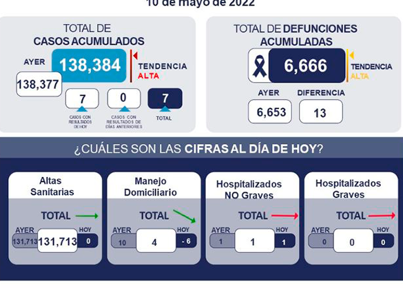 Con sintomatología leve, aislamiento y manejo en su domicilio hay cuatro pacientes y uno hospitalizado. Se han registrado seis mil 666 defunciones.