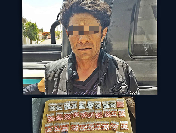 Tras llevar a cabo la inspección, se le localizaron entre sus pertenencias 49 bolsas plásticas de sustancia cristalina con características similares a la metanfetamina, lo que representa un delito de acuerdo a la Ley General de Salud.