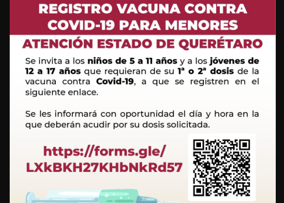 Abrirán una nueva campaña de vacunación para proteger a los menores de edad contra el COVID-19, A través de la página de Facebook de la Delegación de Programas para el Bienestar Querétaro, se lanzó la convocatoria en la que piden a los padres y madres de familia llenar un formulario con el nombre del menor y un número telefónico para poder agendar una cita.