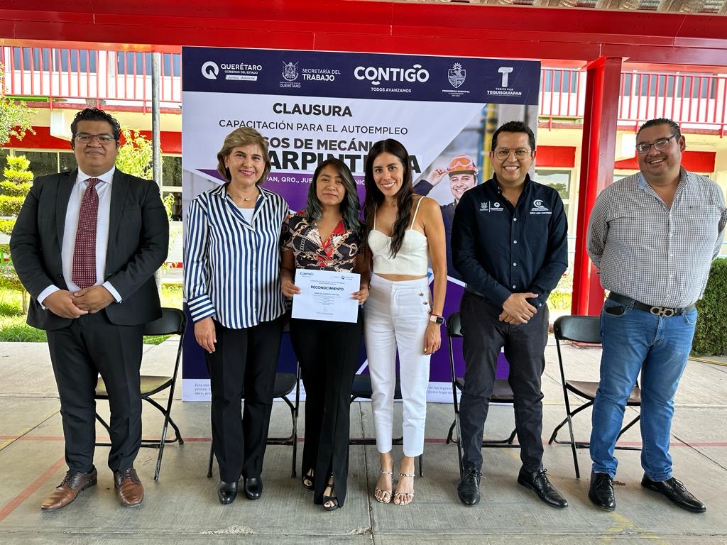 La titular de la Secretaría del Trabajo (ST), Liliana San Martín Castillo, entregó constancias de capacitación para el autoempleo a 40 mujeres tequisqueapenses, quienes concluyeron los cursos de Carpintería y Mecánica automotriz, mismos que fueron impartidos en el Centro de Capacitación para el Trabajo Industrial CECATI 122 de este municipio.