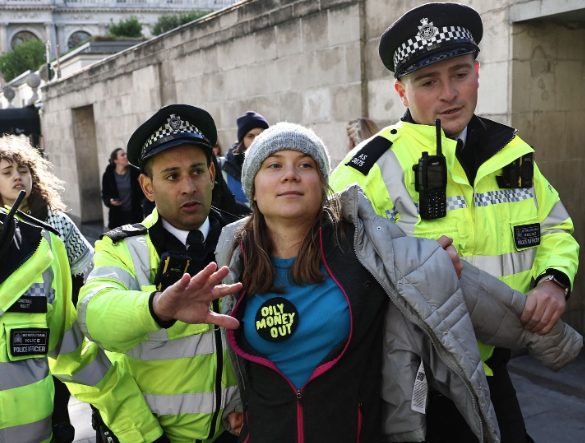 Las imágenes de vídeo mostraron a Thunberg, con una placa con el lema “Oily Money Out” (Fuera el dinero aceitoso), parada tranquilamente mientras dos agentes de policía le hablaban. Uno fue visto sosteniendo su brazo. La Policía Metropolitana de Londres no proporcionó inmediatamente una declaración cuando fue contactada.