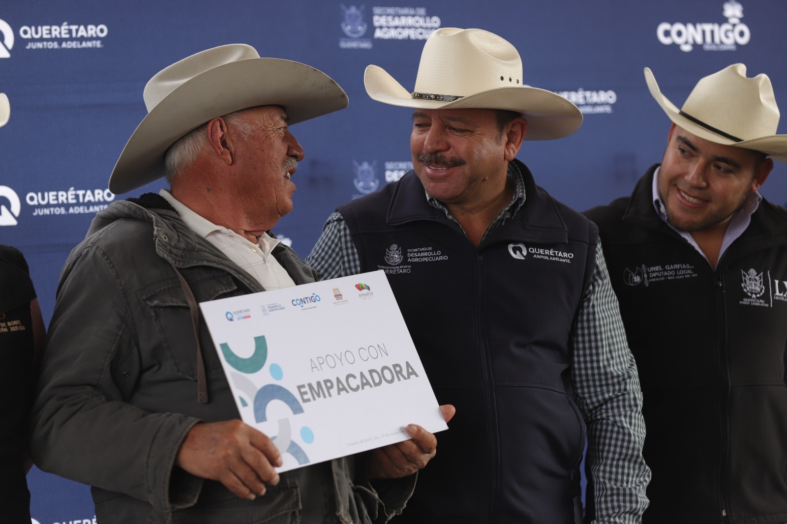 El director regional de la Secretaría de Desarrollo Agropecuario (SEDEA) en San Juan del Río, Juan Aguilar, en representación del titular, Rosendo Anaya, encabezó en Amealco de Bonfil, la entrega de apoyos en beneficio de 157 productores, a través del programa Impulso al Dinamismo en el Sector Agroalimentario. Para este 2023, el programa contempló una inversión bipartita de 17 millones 131 mil pesos, de los cuales, el Gobierno del Estado aporta 10 millones 278 mil pesos.