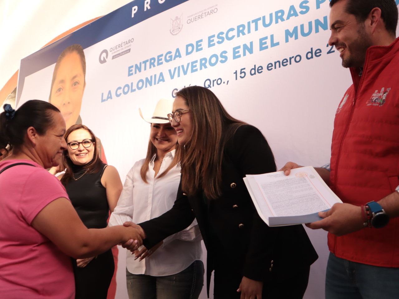 La secretaria de Desarrollo Social en el Estado (SEDESOQ), Diana Yadira Pérez Mejía, encabezó la entrega de 44 escrituras públicas para brindar certeza jurídica al patrimonio de más de 170 habitantes del Asentamiento Humano Viveros, en el municipio de Colón y con ello, asegurar el acceso a los servicios básicos para las viviendas de la zona. Dichas actas notariales se suman a las 758 que la dependencia entregó durante el año 2023.