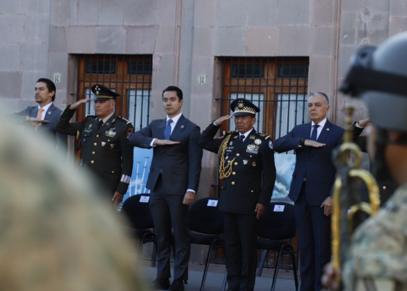 En el Jardín Guerrero, el presidente municipal de Querétaro, Felifer Macías, encabezó la ceremonia de honores a la bandera, en compañía por el General de Brigada Estado Mayor Vinicio Perea Alcaraz, comandante de la Décimo Séptima Zona Militar, y el Comisario Jefe Filiberto Oropeza Fabián, coordinador estatal de la Guardia Nacional en Querétaro, y destacó el compromiso de las instituciones de seguridad para trabajar en equipo y procurar por la tranquilidad de las familias queretanas.