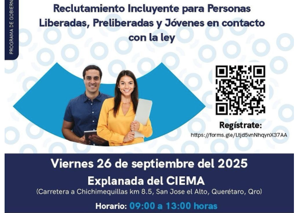 La Secretaría del Trabajo en colaboración con la Comisión Estatal del Sistema Penitenciario y el Centro de Internamiento para Adolescentes, anuncian el reclutamiento incluyente mediante el cual se acercarán ofertas de empleo a personas liberadas, preliberadas y jóvenes en contacto con la ley, así como para familiares en búsqueda de empleo, el cual se llevará a cabo el próximo 26 de septiembre en las instalaciones del CIEMA en horario de 9:00 a 13:00 horas.