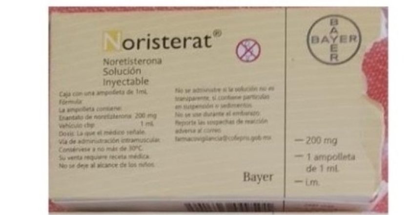La alerta se emite a partir del análisis y evaluación de la información presentada por BAYER DE MÉXICO S.A. de C.V., titular del registro sanitario, quien informó que el producto Noristerat 200mg/mL presenta irregularidades en el empaque primario y secundario, así como en el producto; la empresa señaló que el lote XB30R0C no contiene el principio activo en tanto de noretisterona, por lo cual se determinó como falsificado.