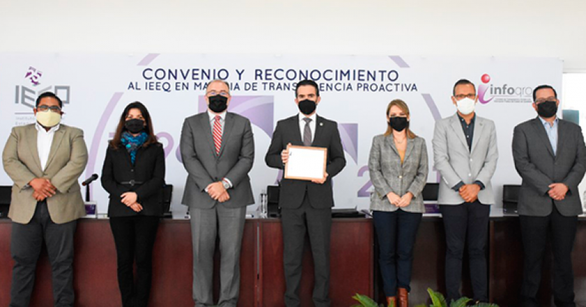 El Instituto Electoral del Estado de Querétaro (IEEQ) recibió el reconocimiento que otorga la Comisión de Transparencia y Acceso a la Información Pública y Protección de Datos Personales del Estado de Querétaro (INFOQRO), por la “Implementación de Prácticas de Transparencia Proactiva en Organismos Autónomos y Tribunales Administrativos”.