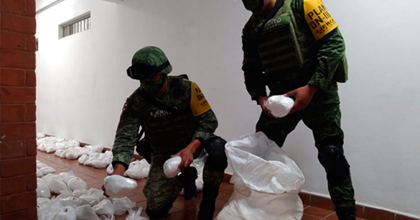 Elementos del Ejército México del 7o Regimiento Mecanizado perteneciente a la 17.ª Zona Militar en el Estado de Querétaro, en coordinación con la Guardia Nacional aseguraron en el Municipio de San Juan del Río 400 paquetes de 1kgs en 14 costales con un peso bruto de 404.74. Kgs.