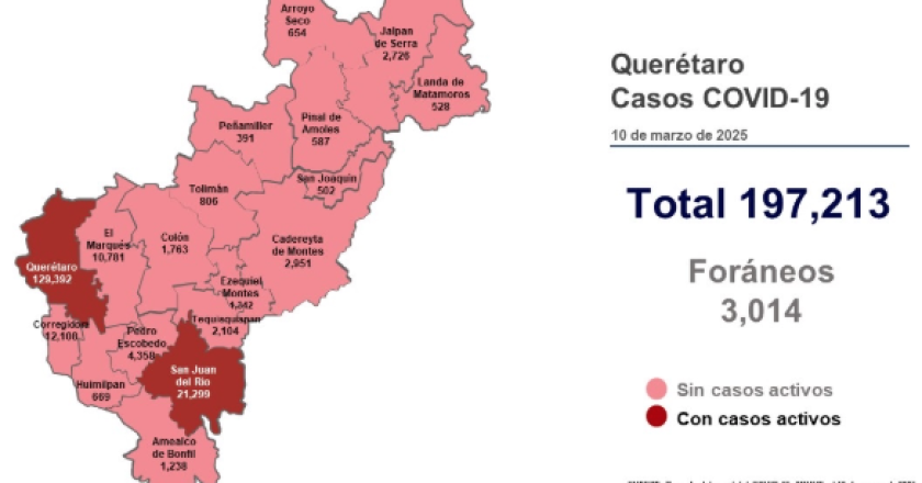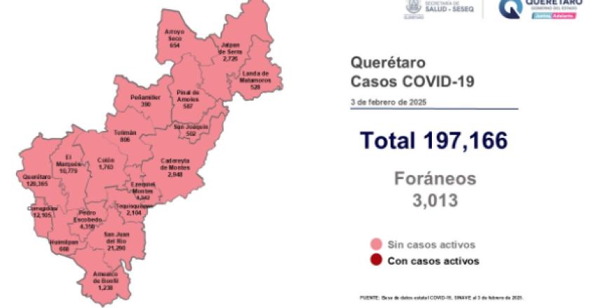 La Secretaría de Salud de Querétaro reportó este lunes cero defunciones por COVID-19, y que en los últimos siete días se han sumado doce casos de la enfermedad en el estado,se trata de seis mujeres y seis hombres. El registro acumulado es de 197 mil 213 casos; 54 por ciento son mujeres y 46 por ciento son hombres.